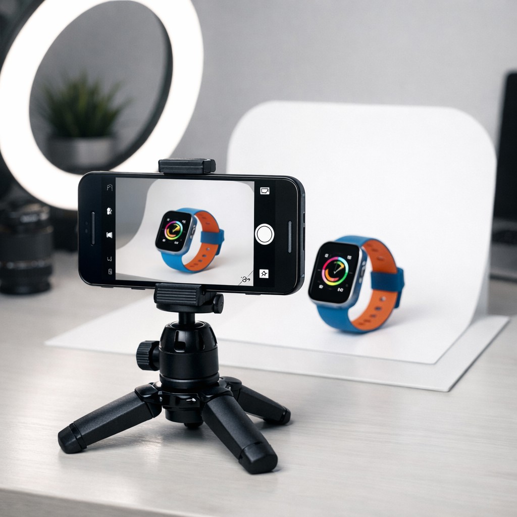 פלש (Flash) ישיר מהטלפון הוא "הורס תמונות" ידוע. הוא יוצר צללים קשים, הברקות לא מחמיאות ומשנה את צבעי המוצר. הפתרון הטוב ביותר הוא תאורה רכה ומפוזרת. אם אין לכם חלון עם אור טבעי רך, השתמשו ברינג לייט. היתרון של רינג לייט הוא היכולת לייצר אור אחיד שמקיף את העדשה ומעלים צללים מיותרים. הקפידו לבחור רינג לייט המאפשר שליטה בטמפרטורת הצבע (אור חם/קר) כדי להתאים לצבעי המוצר האמיתיים.