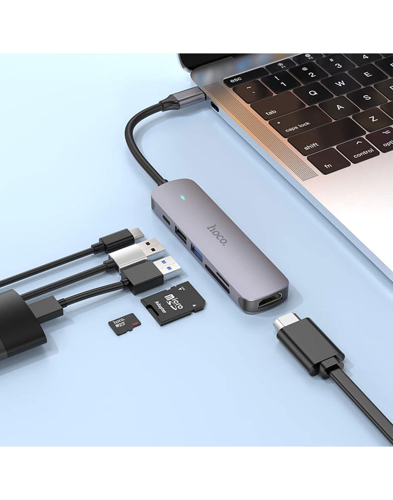 ה־Hoco HB28 הוא מתאם Type-C חכם וקומפקטי המציע שישה חיבורים חיוניים במכשיר אחד. הוא מאפשר חיבור למסך חיצוני באיכות ‎4K‎, טעינה מהירה עד ‎60W‎, העברת נתונים מהירה, וקריאת כרטיסי זיכרון – הכול דרך חיבור Type-C יחיד.